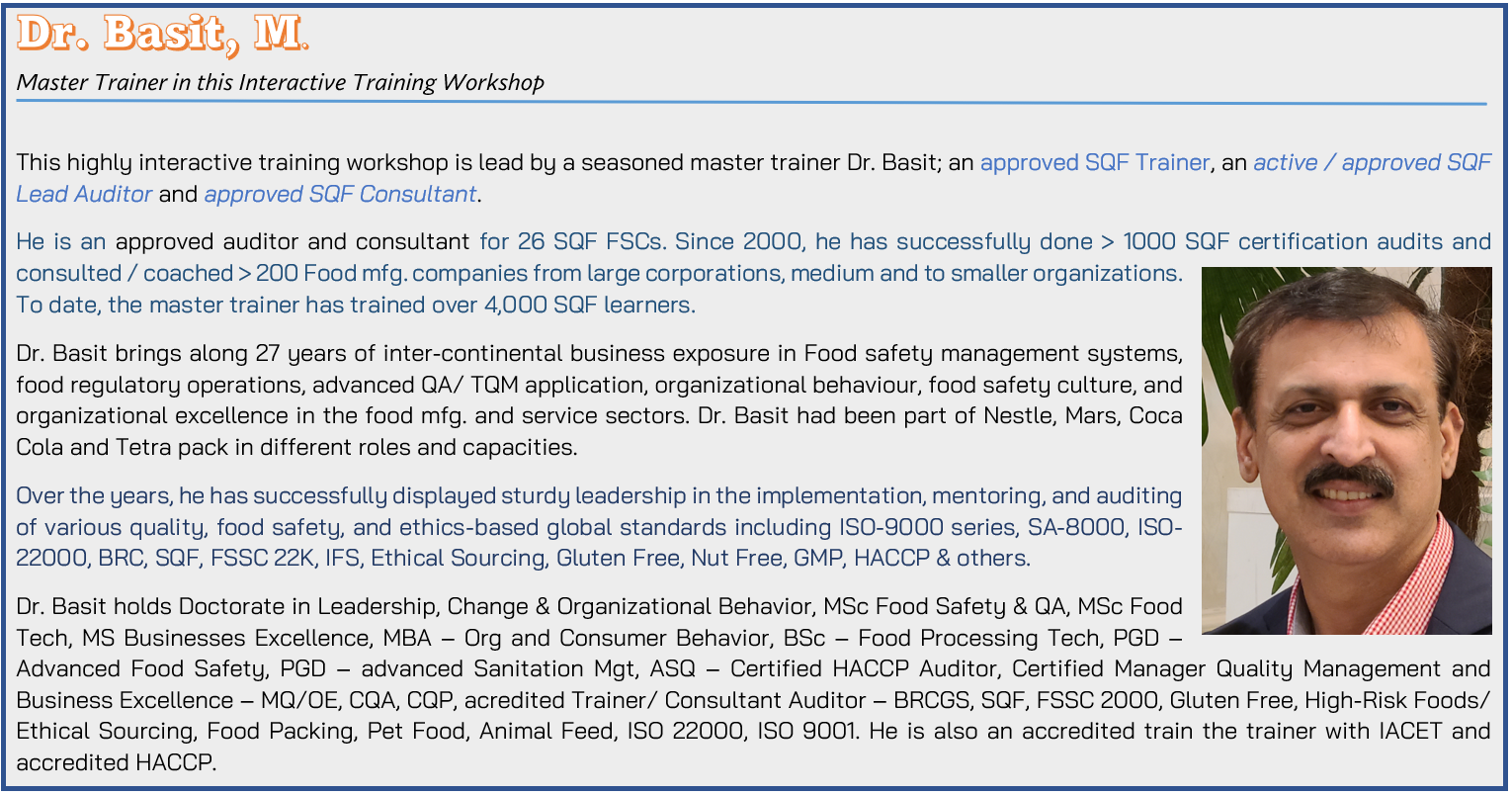 This training workshop offers insight and skill to understand SQF fundamentals, applicable modules, and specific details in these modules pertaining different programs and sections. Beyond basic knowledge about requirements, the learners will get an opportunity to explore various implementation techniques and bottlenecks in SQF system implementation and maintenance. The workshop’s intercave nature ensures learning is hands-on. Learners explore how to find issues before these are highlighted through internal and external product failures, customer complaints and, external audits (e.g., customer audits, certification and reassessment audits) failures.